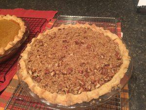 Combine butter, ½ cup flour, and ½ cup brown sugar: blend well. Stir in pecans; sprinkle mixture on pie. Bake at 350 for an additional minutes. Yield: one 10-inch pie.