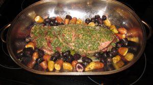 Preheat oven to 450 degrees. Toss together potatoes and remaining 1 tsp salt, 1 tsp pepper and 4 tbs your choice melted fat; place around lamb in roasting pan. Bake at 450 for 45 mins to an hour or until a meat thermometer inserted into thickest portions register 125 (rare). Remove lamb from pan and let stand 15 mins before slicing. Serve with potatoes and pan juices; fresh steamed asparagus rounded out the meal nicely.
