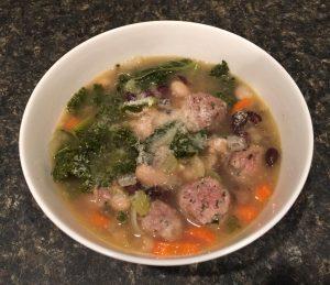 Meanwhile slice the brats and brown in a cast iron skillet. Set aside. When the kale is tender season to taste with the sea salt and pepper, add the drained beans, browned brats and simmer 5 minutes more to heat through, uncovered. Stir in vinegar and rosemary and serve.