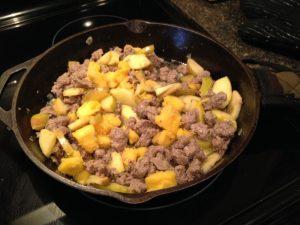 Melt the tablespoon of fat over medium heat in a cast iron skillet; add the onions, sausage and apples and cook until sausage is no longer pink and apples are slightly tender -- stirring occasionally.