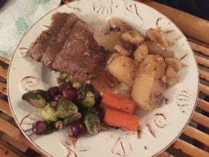 Remove the meat and veggies to a platter and keep warm.  Pour the pan juices into a medium cast iron skillet and heat to just a bare boil.  Mix the cornstarch and water until smooth and add to the juices; cook stirring constantly until thickened.