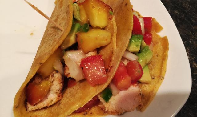 Boneless, skinless chicken breasts are not my favorite protein. I prefer my meat the way it came -- on a bone and with skin. They do have their place in some recipes. . . tacos anyone? And it's peach season, tickle your taste buds with this seasonal dynamic duo!